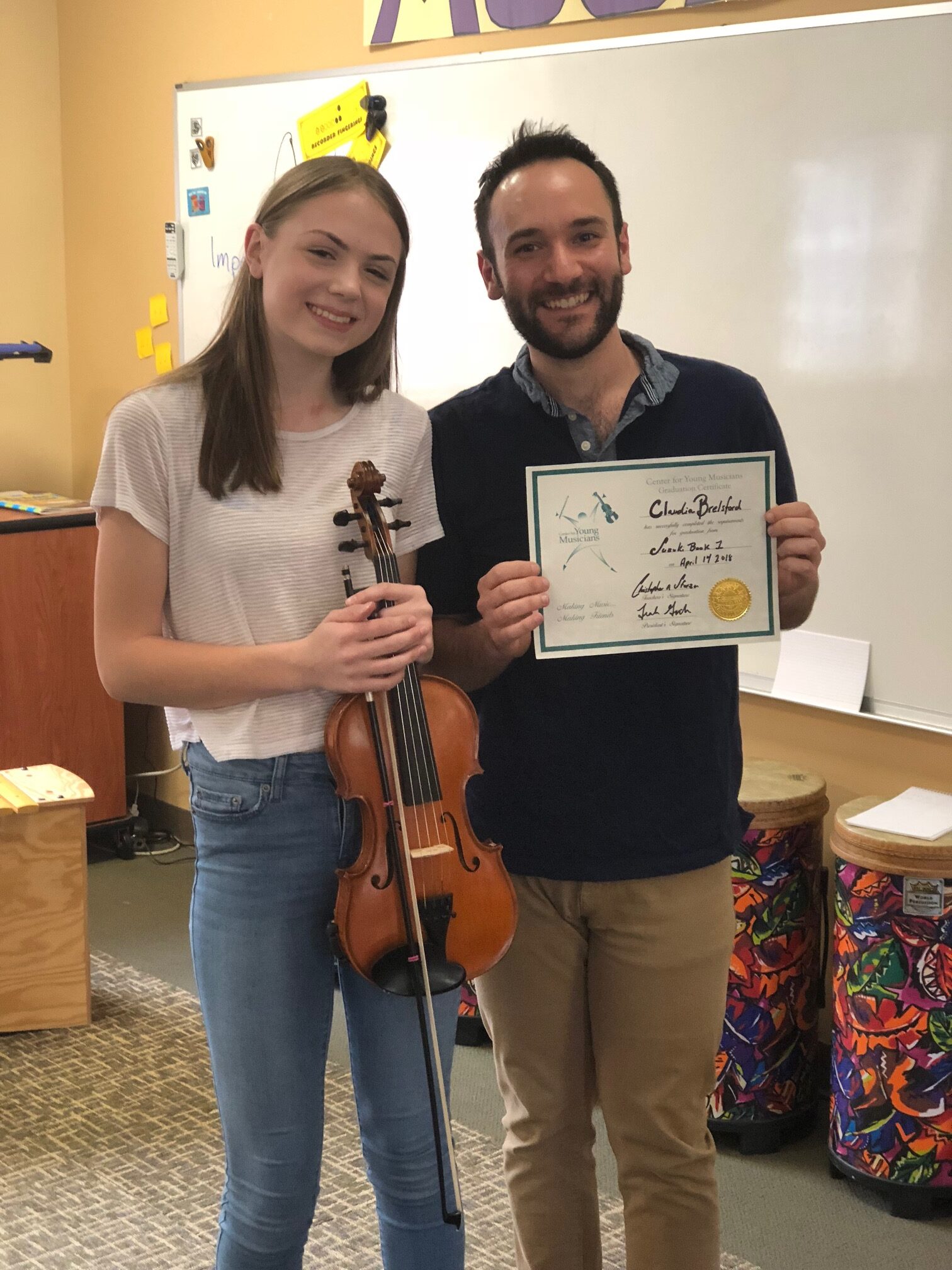 “Claudia joined my studio during my early days at CYM when I was a brand new teacher. Having taken a short pause with lessons, Claudia was excited to pick up her instrument once again and continue learning. From our very first lessons we knew just how well we would work together. Our personalities and energy compliment each other and each lesson has been filled with focused learning, beautiful music, thousands of laughs, and wonderful fun. Claudia puts time and effort into each of her activities, whether it’s violin, sports, or academics. She completes them in a thoughtful and goal-oriented way. Many teenage students become very busy with their school work and in their personal lives. Claudia never let her other activities get in the way of her violin playing. Even through some of the most busiest and stressful high school times we still made room for violin. I want to congratulate Claudia on all her successes through the years and for those to come and also wish her the best as she starts her newest chapter.”