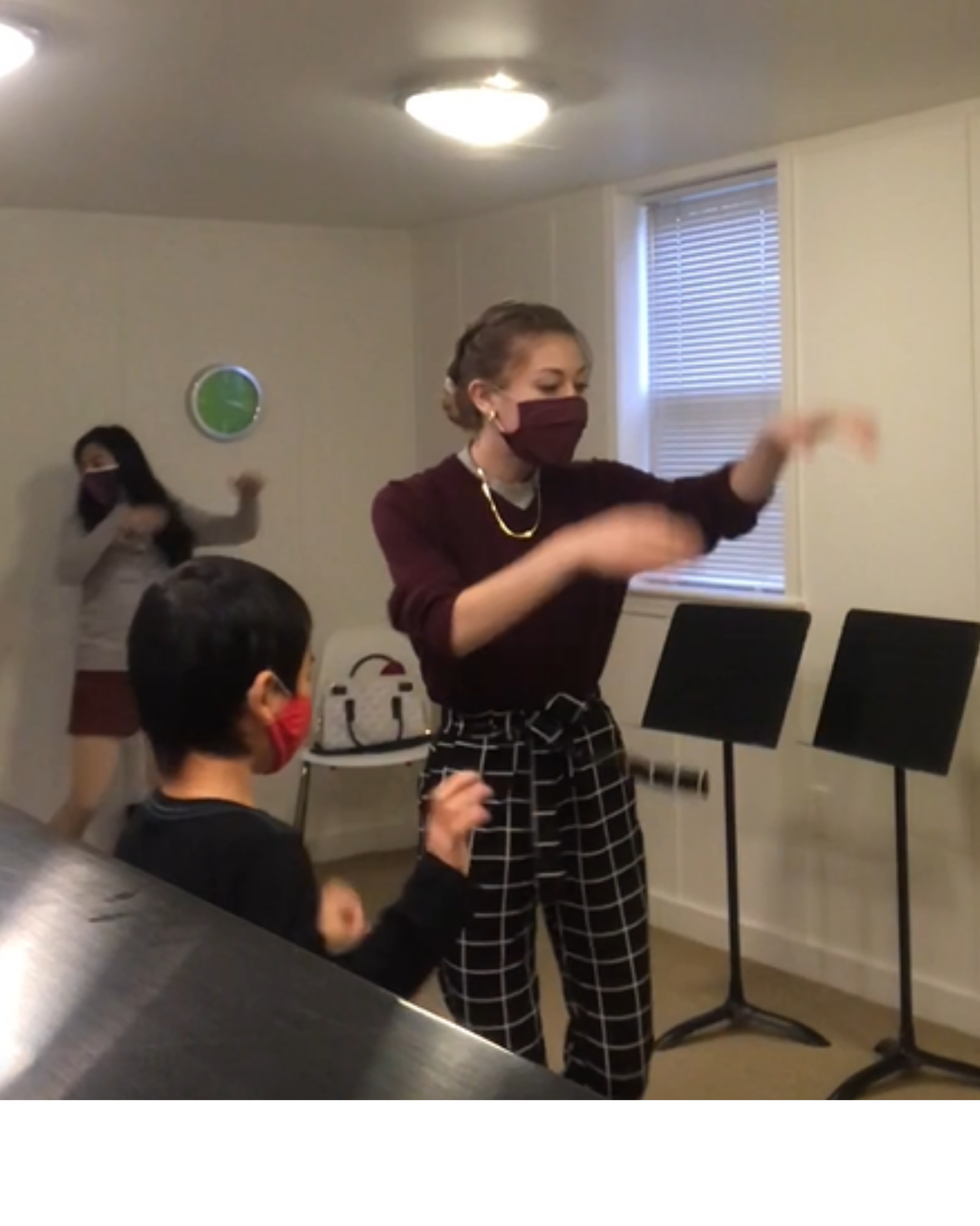 Each week in December students were absorbed by this dynamic program. They worked to identify and play unpitched percussion instruments and refine specific aspects of their piano performance. We discussed each unpitched percussion instrument used during this level of the course: hand drums, sand blocks, rhythm sticks, and finger cymbals. After being able to aurally identify and name these instruments, we talked about how to properly play them to produce the fullest sound. When incorporating the instruments into our song, “Sally Go ‘Round the Sun,” one student stated, “We should play the hand drum after saying the word ‘moon,’ and the finger cymbals after saying the word ‘sun’!” When I asked why, she explained that the finger cymbals have a brighter sound, connecting it to the sun, and that the hand drum has a darker sound, connecting it to the moon.