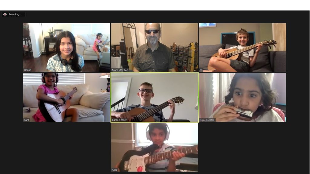 During the month of August, some of the music school’s students met in “Learn to Play the Blues”: Aarnav, Carson, Elijah, Riya, and Sara, on the guitar, and Audrey and Hanna on the piano. Students improvised using the pentatonic minor scale in a new key each week and played 12- bar blues accompaniments. Mr. Mark led each student to successful integrate these techniques, by appropriately challenging their particular skill level and age.